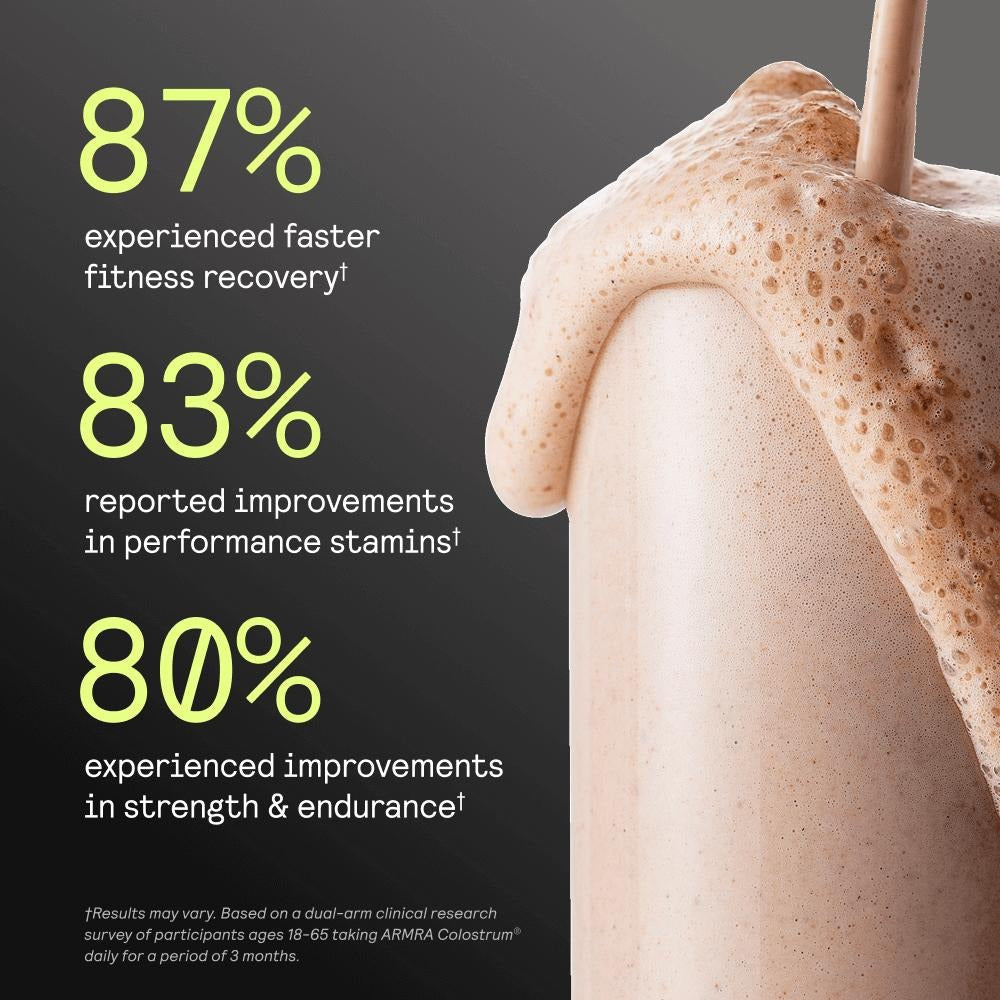 ARMRA Colostrum®can be easily stirred into liquid, mixed with things like yogurt, or sprinkled into any other food, as long as it isn’t hot, as this can degrade its 400+ bioactive compounds. For the most potent benefits, many customers enjoy dry scooping ARMRA Unflavored directly into their mouth to maximize contact with the mucosal surfaces of the mouth and esophagus. Additionally, it doesn’t matter what time of day you take it — whenever works best for you to incorporate your 4+ scoops into your daily routine.